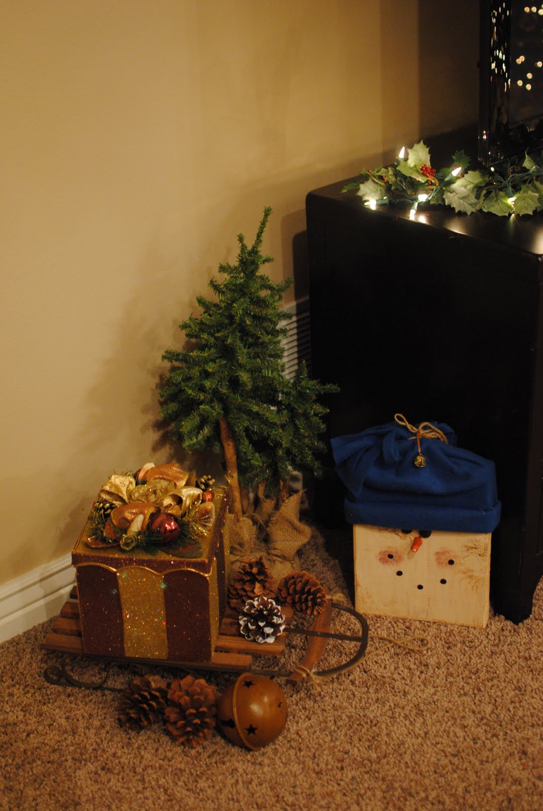 This little bunch of decor is sitting on the floor next to the entertainment center. We received that cute gift box full of Christmas ornaments as a wedding gift. The box was too cute not to use! My mom made the snowman, and the little sled was a Real Deals steal last year. Tyson had the tree from when he first moved into this house.